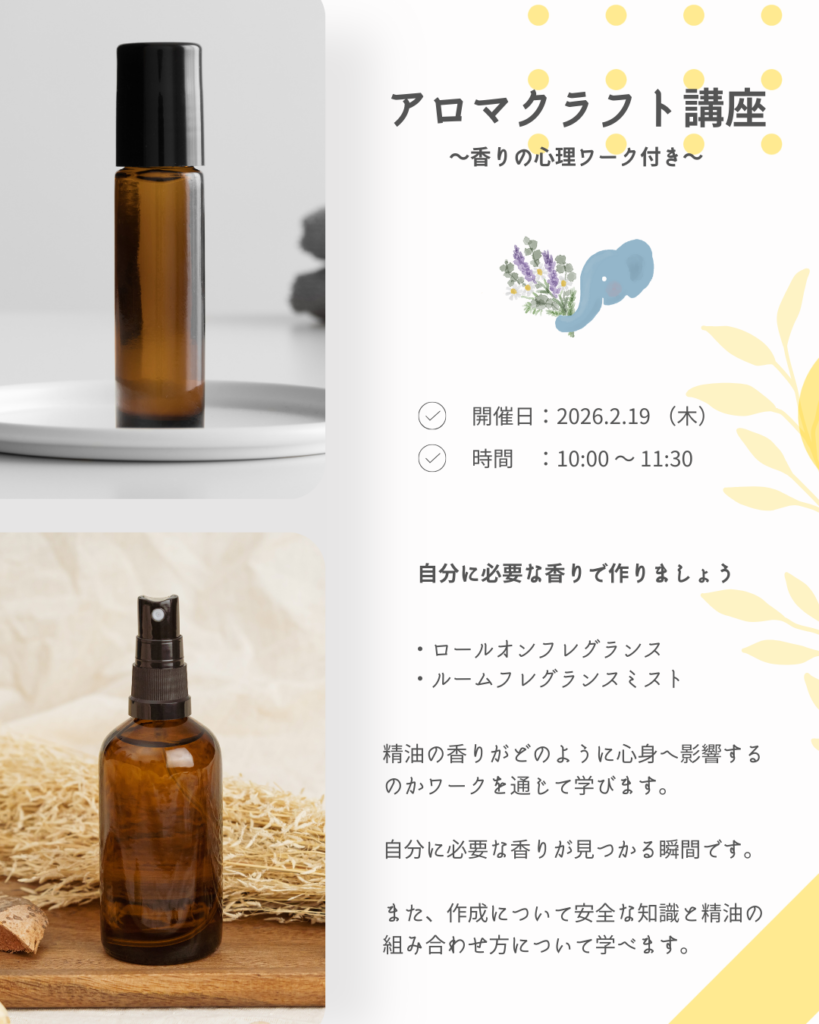 手に取った精油の香りが今の心身にどのように影響しているかを「心理ワーク」を通して学びながら気づきを得る講座です。